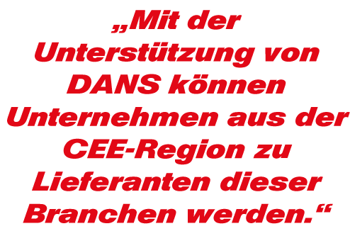 Bei DANS beobachten wir eine massive Umstrukturierung der internationalen Lieferketten in den Bereichen Verteidigung, Luft- und Raumfahrt, Marine und Weltraum und sind überzeugt, dass Unternehmen aus Mittel- und Osteuropa zu den Nutznießern dieses globalen Transformationsprozesses gehören können. Sei es Verlagerung, Diversifizierung, industrielle Zusammenarbeit, globale Expansion oder die Implementierung neuer Programme die OEMs (Original Equipment Manufacturers) dazu motiviert ihre Lieferketten weiterzuentwickeln – mit dem professionellen Hintergrund und der Unterstützung von DANS können Unternehmen aus der CEE-Region (Mittel- und Osteuropa) zu ausgewählten und vertrauenswürdigen Lieferanten dieser Branchen werden.